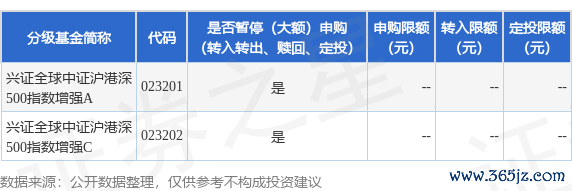 本站消息,10月27日兴证全球基金管理有限公司发布《兴证全球中证沪港深500指数增强型证券投资基金暂停申购(含定投)、赎回、转换业务的公告》。公告中提示,为非港股通交易日,自2025年10月29日起兴证全球中证沪港深500指数增强型证券投资基金暂停申购(含定投)、赎回、转换业务,下属分级基金调整明细如下: