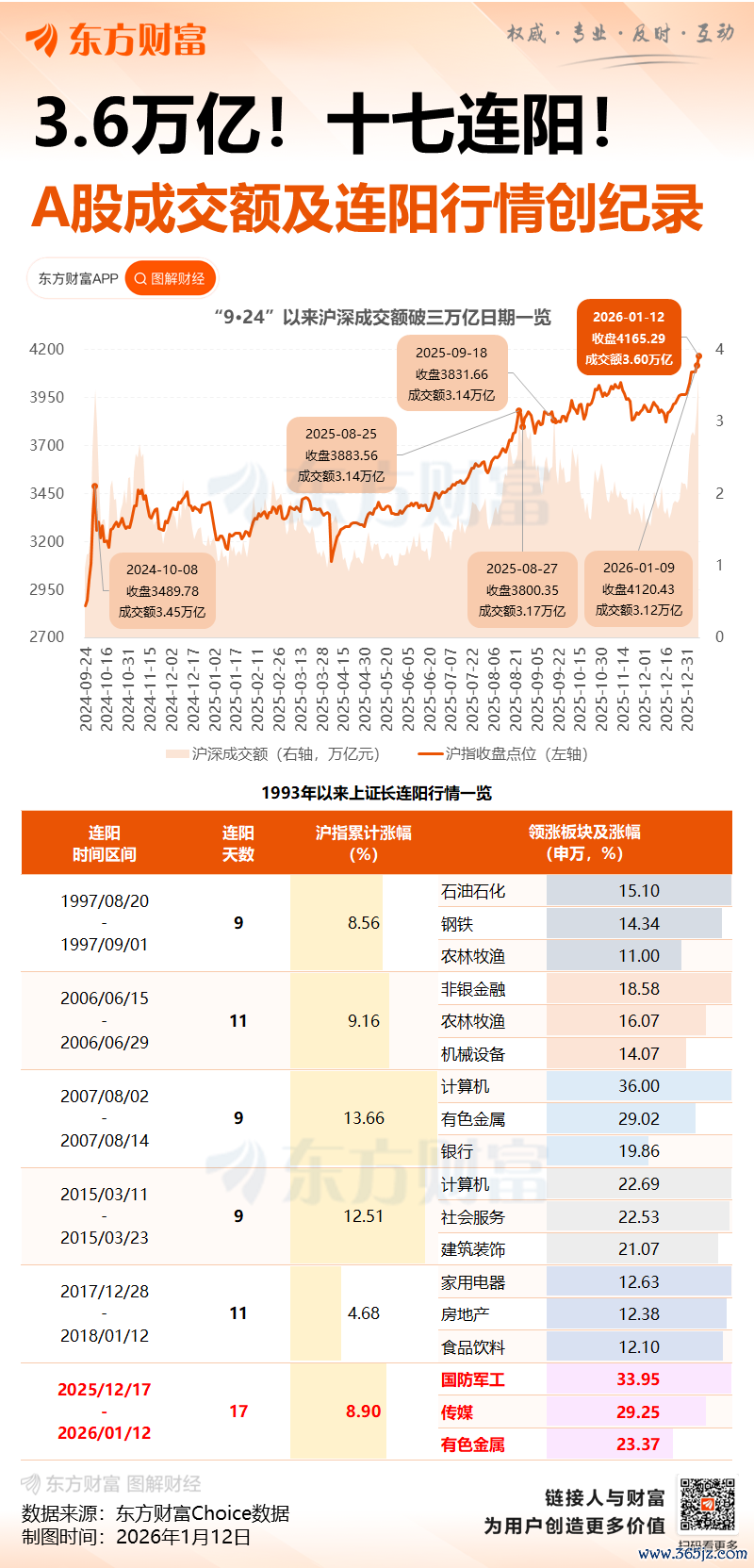 全市场超4100只个股上涨,其中201只个股涨停。沪深两市成交额3.6万亿元,连续第2个交易日突破3万亿,较上一个交易日放量4787亿,刷新此前在2024年10月8日创下的成交额历史纪录。